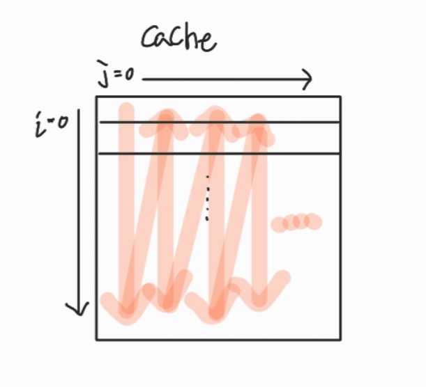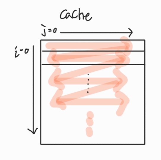 버전 2는 어떨까? 행을 고정시키고 열 방향으로 곱해간다 그러면 다음과 같이 볼 수 있다. 만약 block size가 8B이고 X [10][8]이라면 Miss가 행이 변할 때 빼고는 없다. 즉, Miss의 비율이 줄어든다.