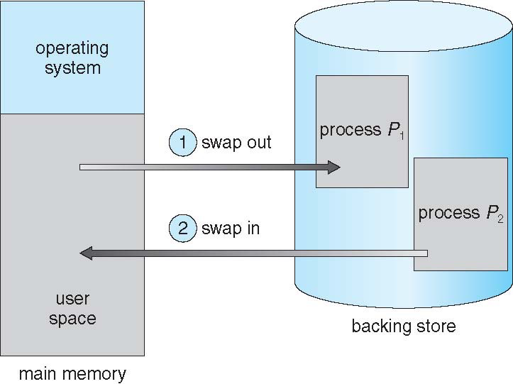 Swapped은 backing store를 만들어서 프로세스 단위로 swap in, swap out을 동작한다. ( backing store는 임시저장소로 하드디스크나 NVM처럼 여러 하드웨어가 될 수 있다. 즉 Secondary Storage다.)